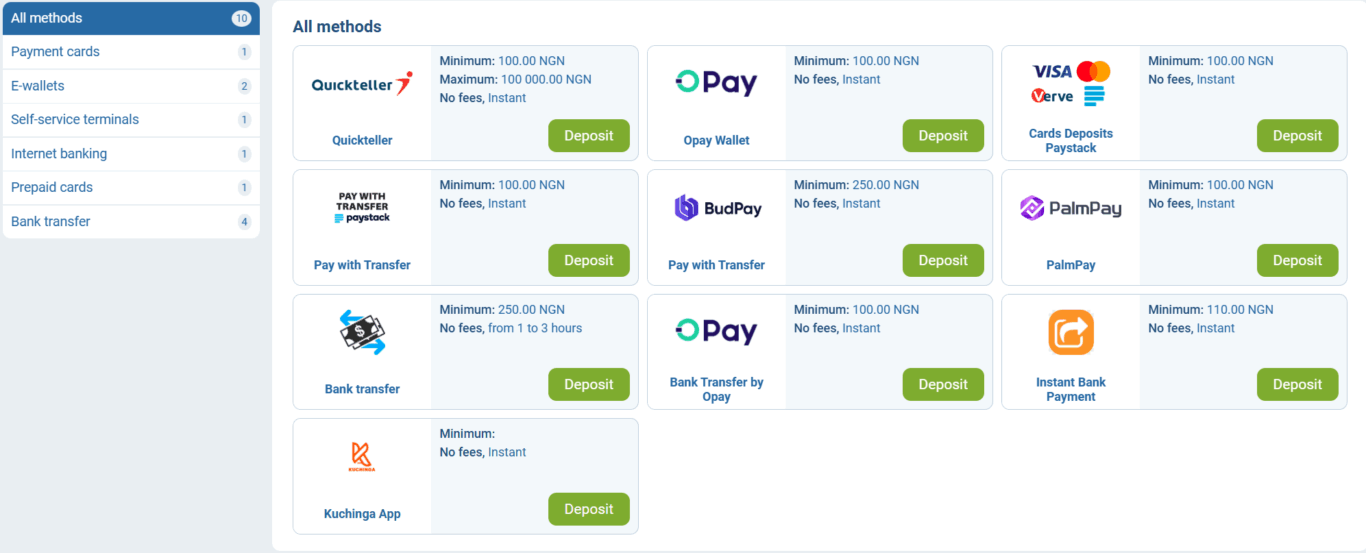 Deposit conditions differ by method, but all categories offer instant crediting and 0% platform fees: